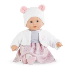 This baby doll is simply enchanting! She's dressed in a lovely pink dress covered in shimmering sparkle spots, a cozy sweater of fluff, and a matching fluff hat with adorable bear ears. She's the perfect size to be cradled in a young child's arms. Her head, arms, and legs are made of soft-touch vinyl that's delicately scented with vanilla. Plus, she has beautiful blue eyes that close when you put her down for a nap! 18 Months +