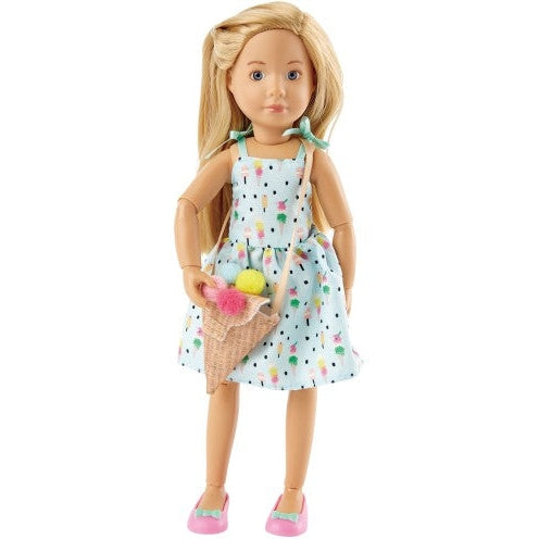 Vera the ice cream lover. Vera wears a brightly colored pinafore, shoes and an ice cream cone bag. Vera is a 23 cm tall doll made of high quality vinyl. She has movable joints and lifelike glass eyes.