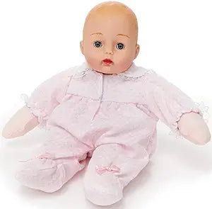This beautiful baby doll with blue eyes and light brown painted hair wears a pink and white checked knit onesie. The onesie has a yoke, gathered body, long sleeves, footed feet and a Peter Pan collar. Pink ribbon on the front and lace trim at the wrists and on the edge of the collar complete this baby's outfit. Ages 2+.