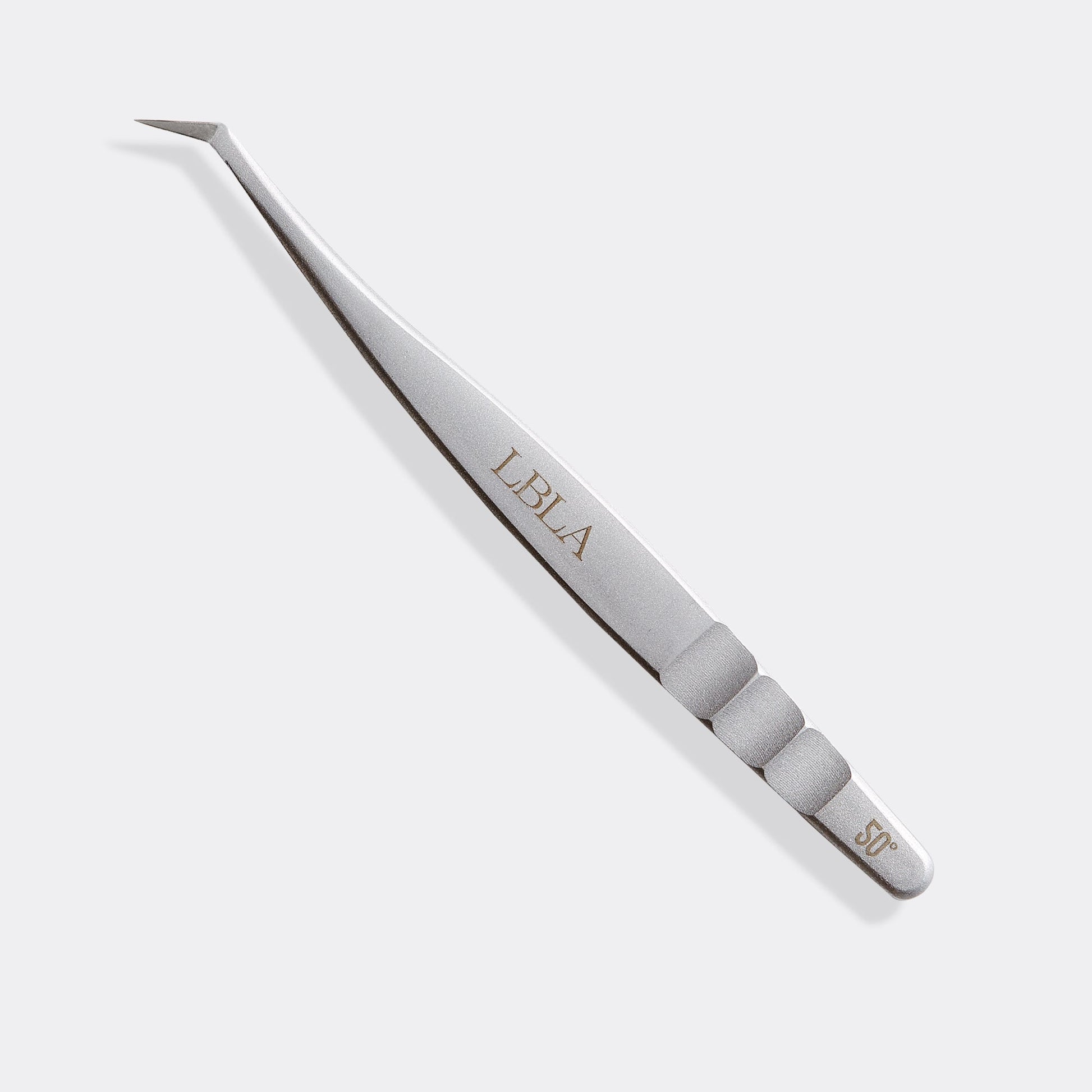 Satin Silver 50 Degree Tweezer- With a longer, ultra-strong tip and boot-like grip, these tweezers are perfect for those that love the angle of our J+ Gold and Biology Tip tweezers and grip with two or more fingers opposite the thumb.