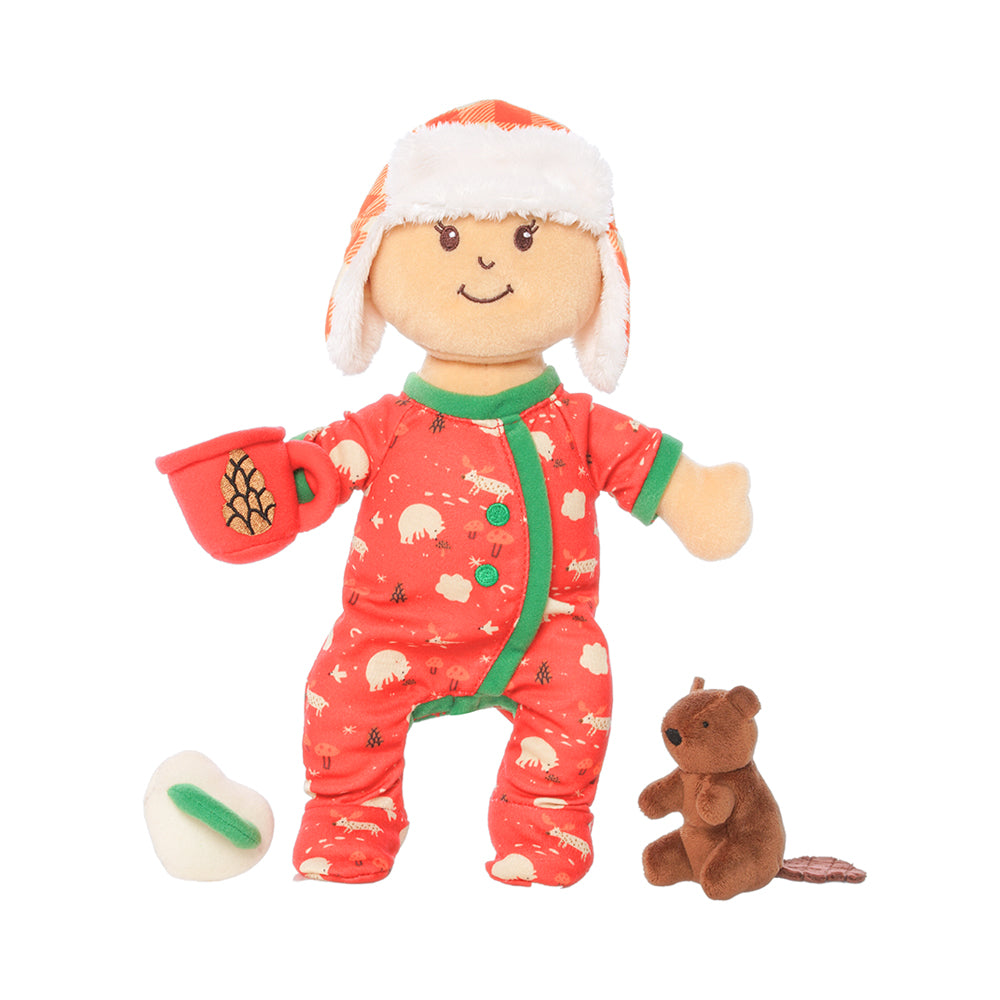 Like all 12-inch Wee Baby dolls, this doll is made with soft fabrics, has embroidered facial features, is durable and beautifully crafted with an adorable belly button and a perfectly plump tummy. The magnetic pacifier is a signature feature of Wee Baby Stella dolls, encouraging cause-and-effect learning. This delightful doll has a beautiful peach skin tone, oval-shaped eyes, a blonde fabric hair tuft, a removable red onesie with woodland animal print, and a orange and cream buffalo check trapper hat. Play accessories include a cup of hot cocoa with an elastic strap for attaching to the doll's hand, and a mini beaver companion. Stella Collection soft dolls are the perfect first baby doll for introducing the littles in your life to a rich world of imaginative roleplay as they develop motor and life skills and enhance social and emotional development through doll playtime.